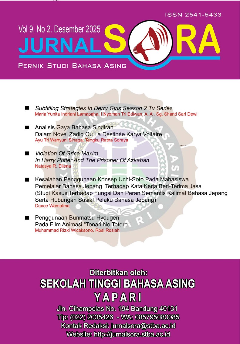 Vol 9 No 2 (2025)Dengan mengucap puji syukur kepada Alloh SWT, Jurnal Sora: Pernik Studi Bahasa Asing Volume 9 Nomor 2 Tahun 2025 telah terbit. Terbitnya edisi kedua di tahun 2025 ini merupakan upaya besar dari pengurus untuk terus memajukan jurnal yang sekarang telah terakreditasi SINTA 5. Pencapaian SINTA 5 ini pun merupakan penghargaan dan apresiasi terhadap pengembangan diri serta minat para peneliti dalam mempublikasikan penelitiannya. Pada Volume 9 Nomor 2 Desember 2025 ini memuat 5 artikel dengan isu-isu yang menarik. Mulai dari artikel pertama membahas mengenai Subtitling Strategies In Derry Girls SeasonTv Series; artikel kedua membahas mengenai Analisis Gaya Bahasa Sindiran Dalam Novel Zadig Ou La Destinée Karya Voltaire; selanjutnya artikel ketiga membahas mengenai Violation Of Grice Maxim In Harry Potter And The Prisoner Of Azkaban ; keempat membahas mengenai Kesalahan Penggunaan Konsep Uchi-Soto Pada Mahasiswa Pemelajar Bahasa Jepang Terhadap Kata Kerja Beri-Terima Jasa (Studi Kasus Terhadap Fungsi dan Peran Semantis Kalimat Bahasa Jepang serta Hubungan Sosial Pelaku Bahasa Jepang) ; dan artikel terakhir membahas tentang Penggunaan Bunmatsu Hyougen Pada Film Animasi “Tonari No Totoro” Kami berharap artikel yang dimuat di Jurnal Sora dapat menjadi ilmu yang bermanfaat terutama bagi yang membacanya.