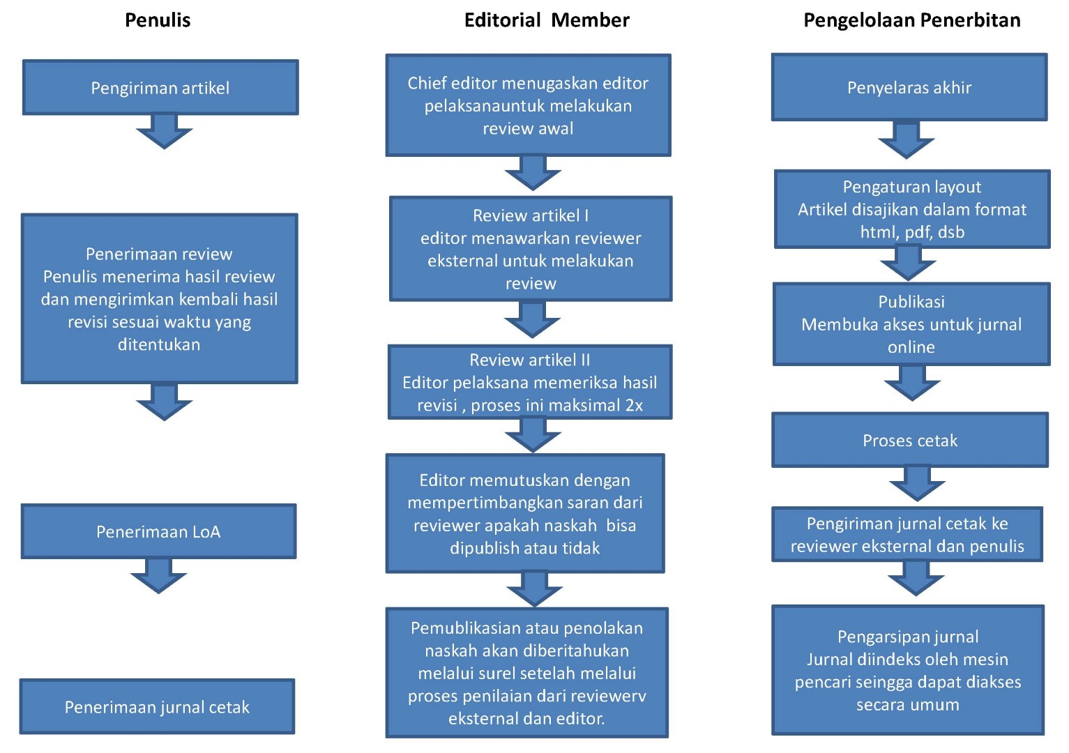 - Editor akan memutuskan dengan mempertimbangkan hasil revisi apakah naskah tersebut sudah memenuhi persyaratan terbit.